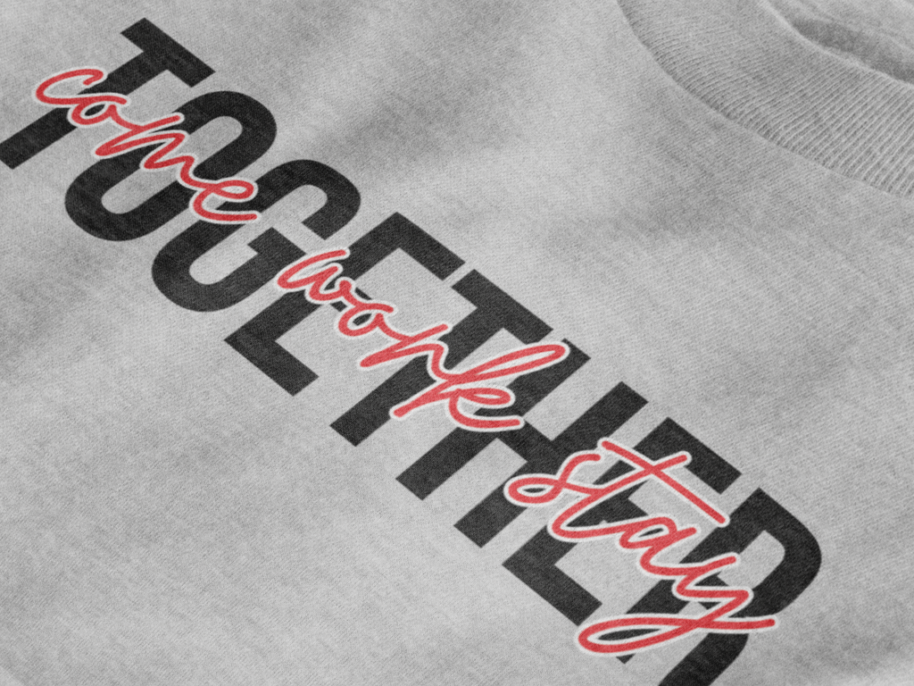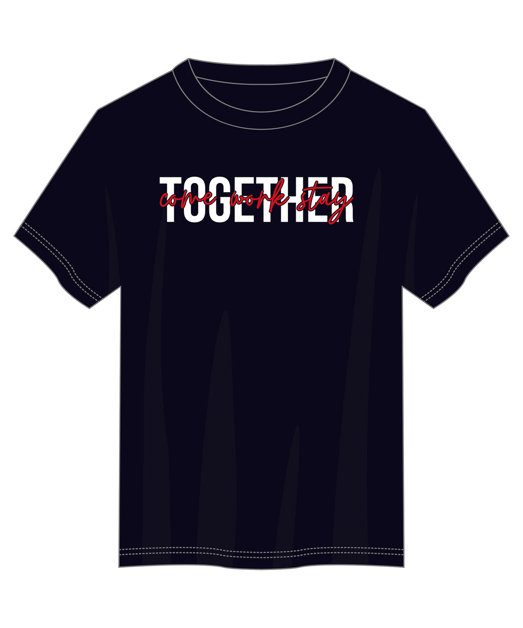 Unity takes intention. This bold statement shirt overlays the phrase “Come. Work. Stay.” in vibrant red script over a strong “TOGETHER” in block letters—reminding us that building something meaningful requires more than just showing up.
