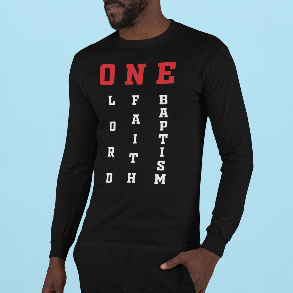 Boldly wear your faith and represent the mission. This quick-dry performance shirt features the powerful declaration from Ephesians 4:5 vertically stacked on the front: