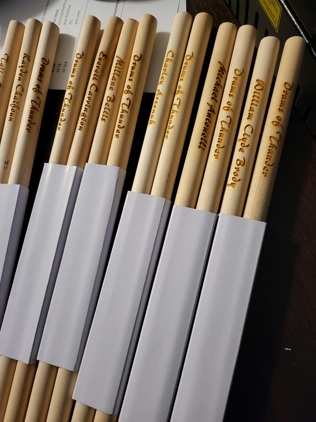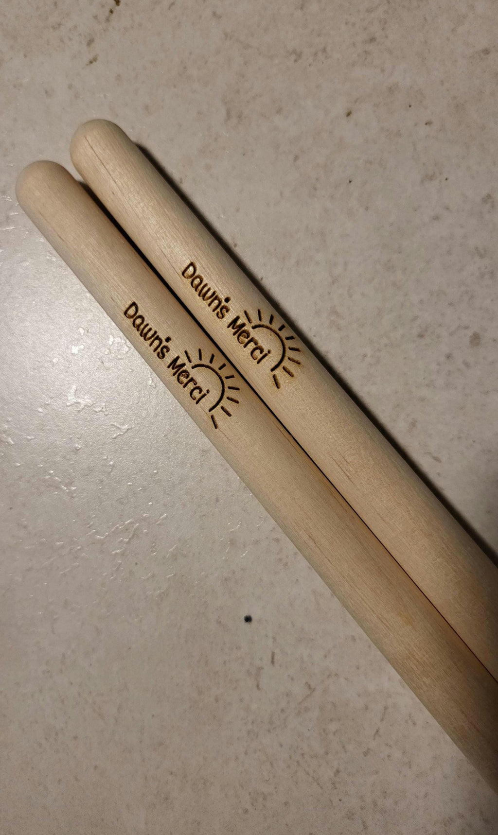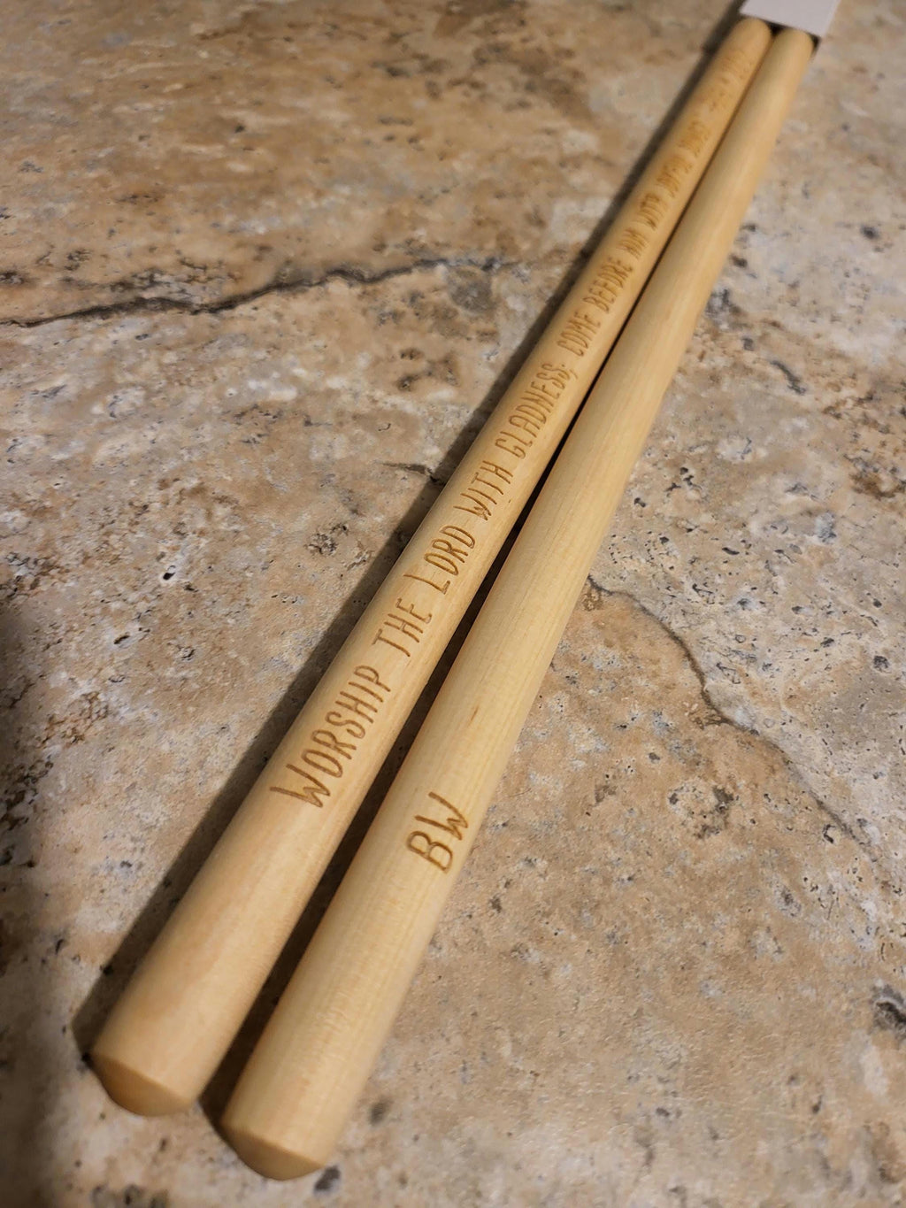 One pair of personalized drum sticks, engraved with a custom message. with this purchase you get a pair (2 sticks), made of hard maple wood. Recommended for display/a sentimental gift, not for playing, due to the way the engraving depth will feel in their hands.