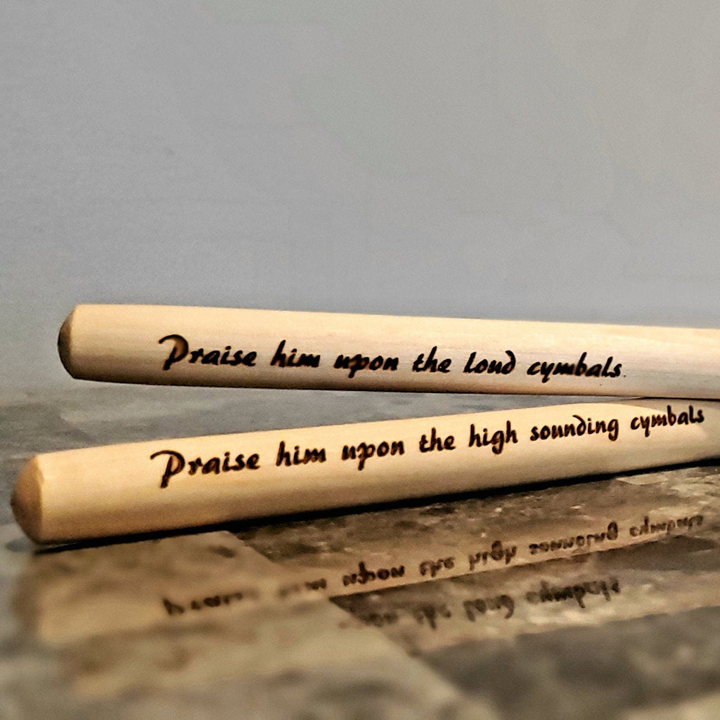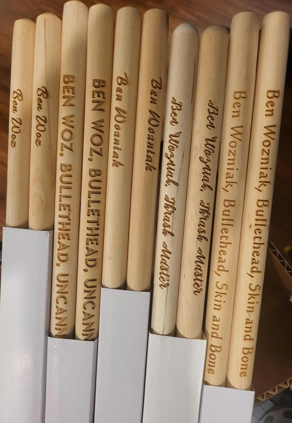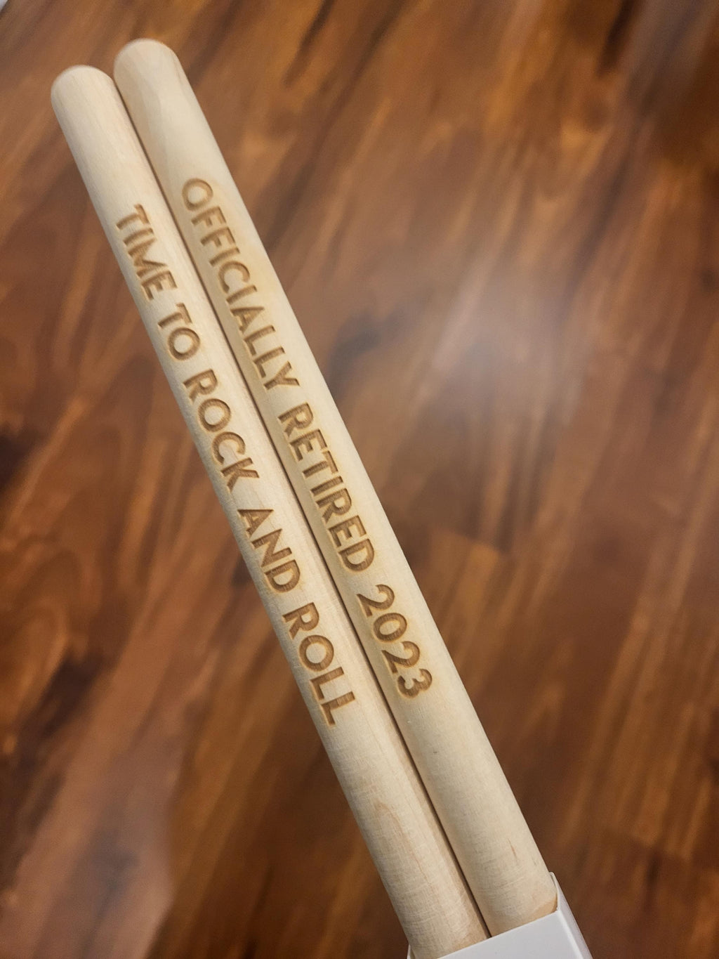 One pair of personalized drum sticks, engraved with a custom message. with this purchase you get a pair (2 sticks), made of hard maple wood. Recommended for display/a sentimental gift, not for playing, due to the way the engraving depth will feel in their hands.